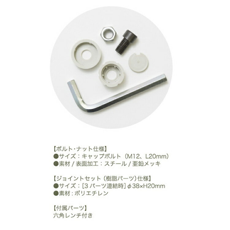 ハコボシリーズはこちら ボルト・ナット仕様 サイズ/キャップボルト(M12、L20mm) 素材/スチール 表面加工/亜鉛メッキ ジョイントセット(樹脂パーツ)仕様 サイズ/φ38×H20(mm)※3パーツ連結時 素材/ポリエチレン 備考 付属パーツ/六角レンチ 注意事項ご注文タイミングやご注文内容によっては、購入履歴からのご注文キャンセル、修正を受け付けることができない場合がございます。